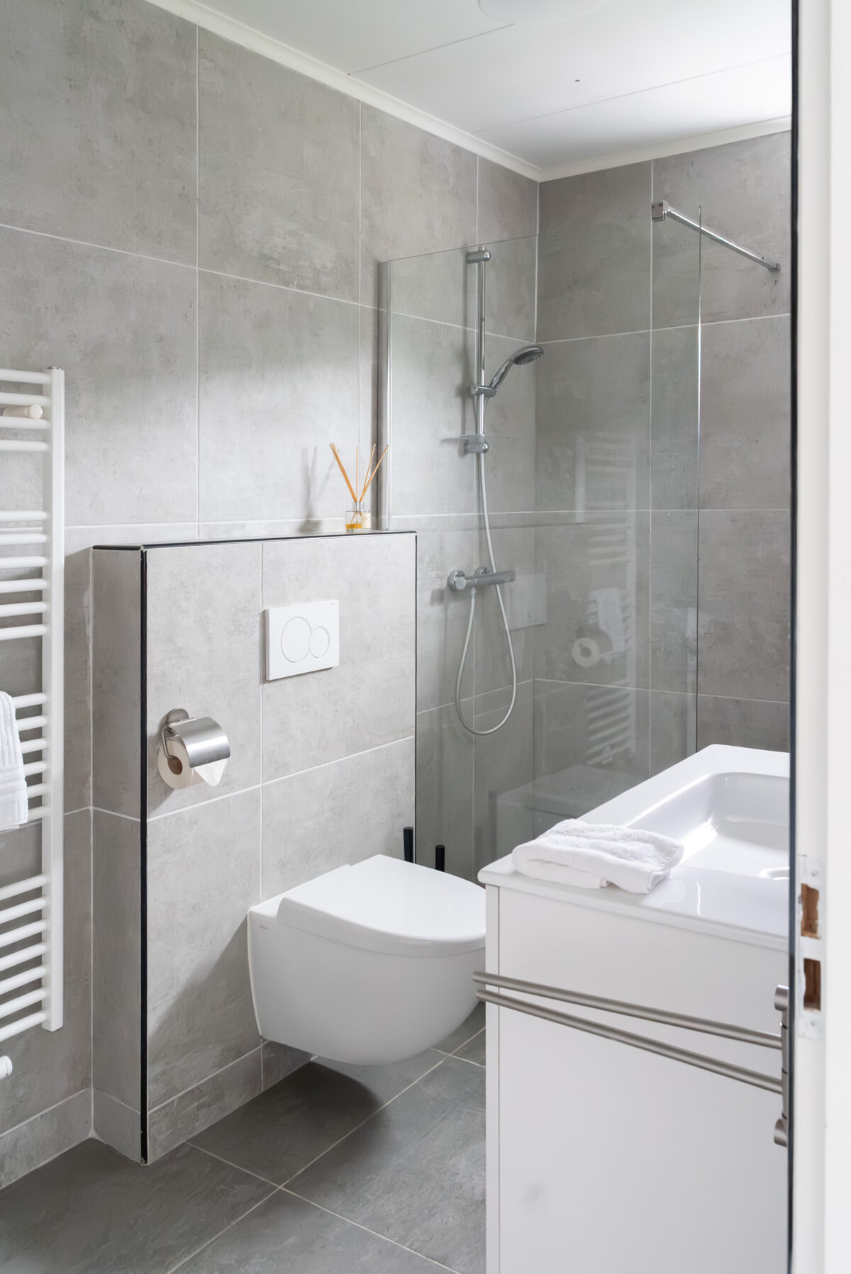De moderne badkamer is uitgerust met een regendouche, toilet en wastafel. Voor iedere gast ligt bij aankomst een handdoekenpakket klaar, afgestemd op de duur van het verblijf.