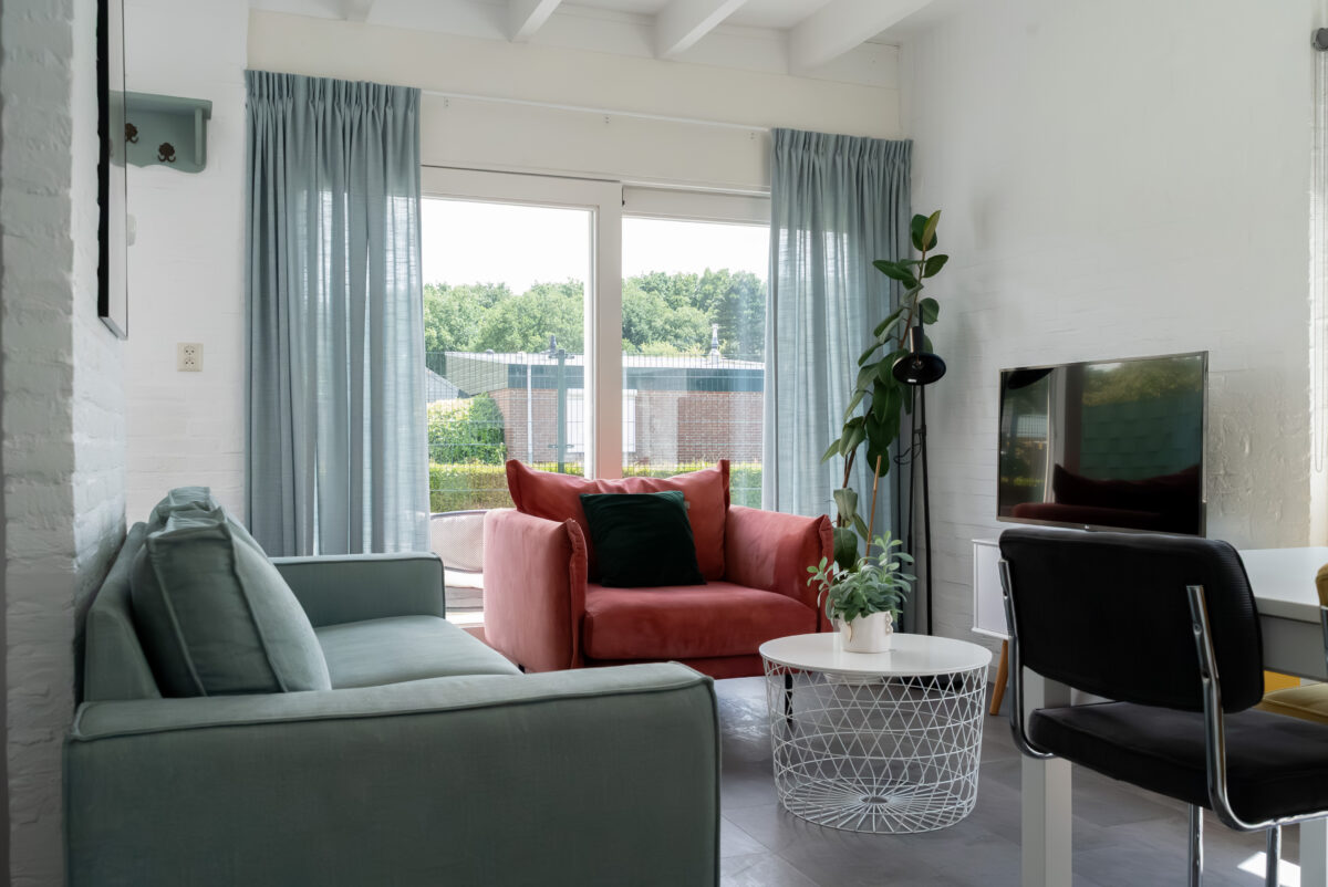 De open leefruimte is ruim en sfeervol ingericht met een eettafel en vier comfortabele stoelen. Aangrenzend bevindt zich de woonkamer met een knusse zithoek en een smart-tv.