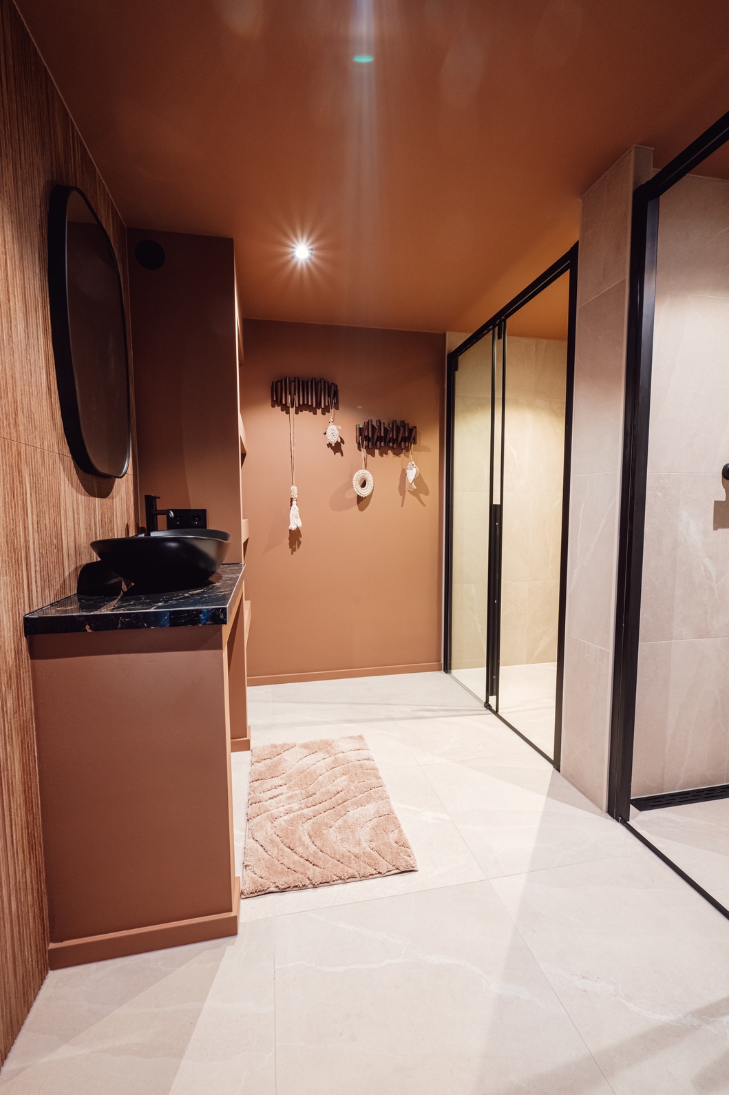 Beneden vindt u twee toiletten en een luxe badkamer met twee douches, spiegels en drie badmeubels.