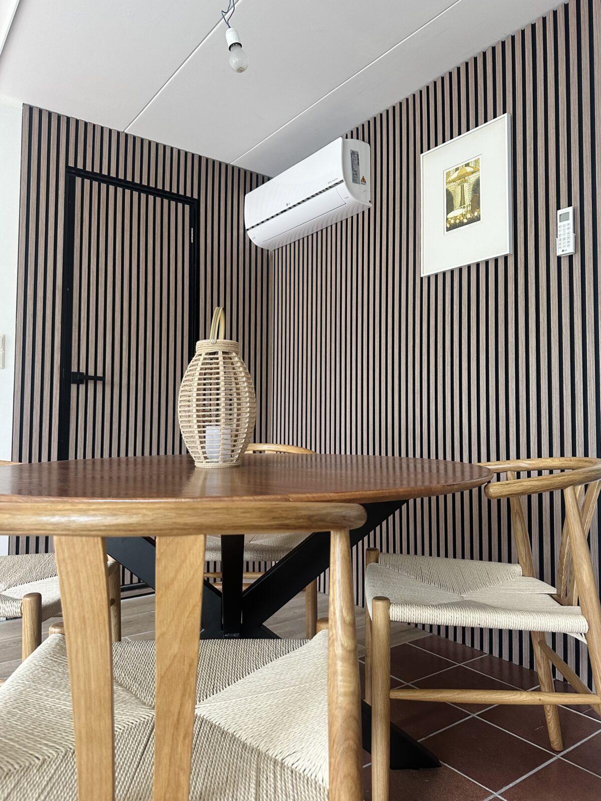 De gehele beneden verdieping is voorzien van airconditioning. Aangrenzend aan de woonkamer vind je de open keuken, van alle gemakken voorzien: Een koelkast met vriesvak, inductie kookplaat, vaatwasser, combi-oven, Nespresso machine en waterkoker. Het keukeninventaris is volledig uitgerust en bij aankomst staan de eerste koffiecups, thee en suiker al voor u klaar.