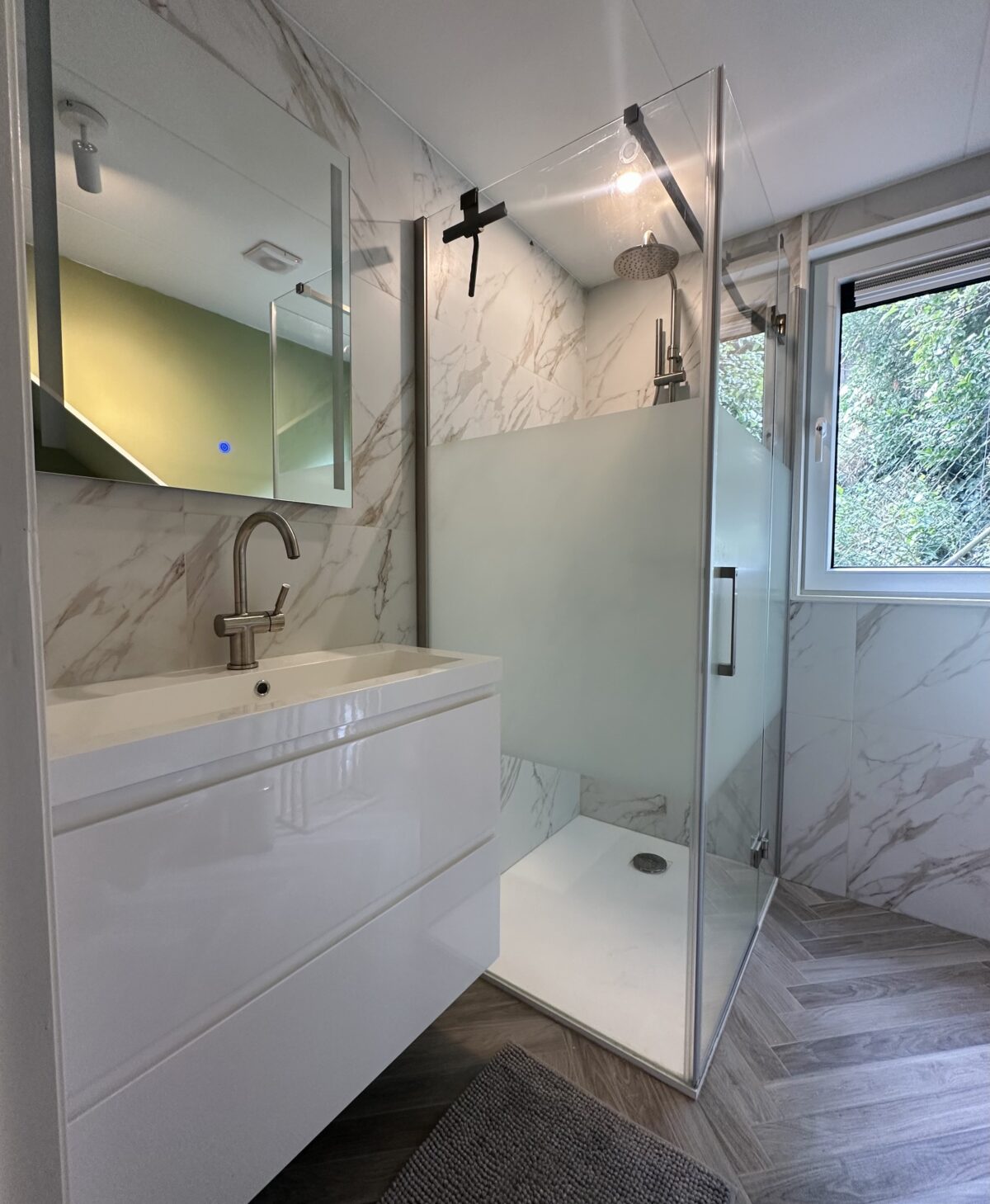 De luxe badkamer boven is voorzien van een moderne wasbak, spiegel met ledverlichting, een heerlijke regendouche en toilet. Voor elke gast ligt er een handdoeken pakket klaar met een handdoek, gastendoek en badmat afgestemd op de duur van je verblijf.